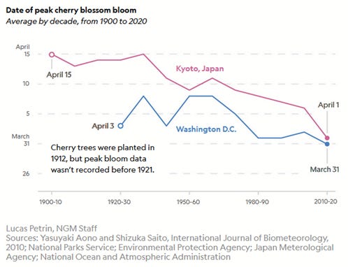 More modern records show the same for cherry trees in both Kyoto and Washington D.C.