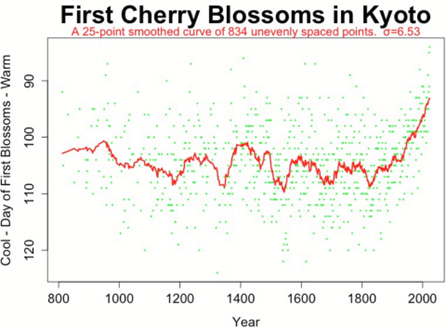 Japan has another handy long-run climate indicator: Cherry blossoms. The spring flowering is a major event there. Kyoto, the ancient capital city, has records of the date cherry trees blossomed going back to the 9th century. Those are the green dots in this chart. The blossoms appear sooner in warmer-than-average years.