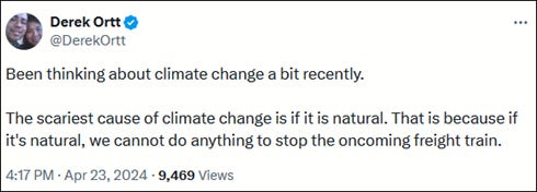 We can debate what is causing higher average temperatures. I think the connection to carbon emissions is pretty clear. Some people insist it’s just natural variability, solar cycles, etc. As Derek points out, we are in even more trouble if climate change isn’t man-made.