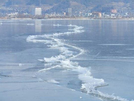 Lake Suwa is in Nagano prefecture, site of the 1998 Winter Olympics. Cold winters made this lake famous for its omiwatari (“God’s Crossing” in Japanese) ice ridges. These form when repeated freezing and thawing builds an elevated path across the water.
