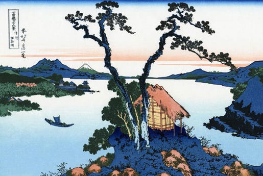 The beautiful image you see above is from Thirty-Six Views of Mount Fuji, a series of 1830s woodblock prints by the Japanese artist Katsushika Hokusai. You can see iconic Mount Fuji in the background.
