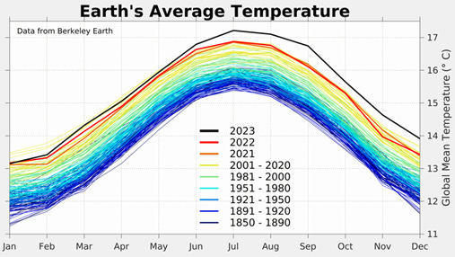 Or, shown another way, here is the average temperature by month. Each line represents one year since 1850. The black one on top is 2023. It was the hottest year on record every month from June through yearend.
