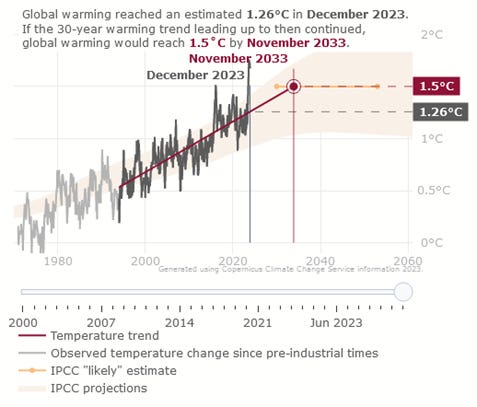 Was 2023 just an especially hot year? Maybe. Other things are happening: an “El Nino” weather pattern, a big volcanic eruption last year, the sun’s natural cycles. But the trend is clear. Filter out the noise and the world is on track to reach 1.5C warming in less than 10 years.
