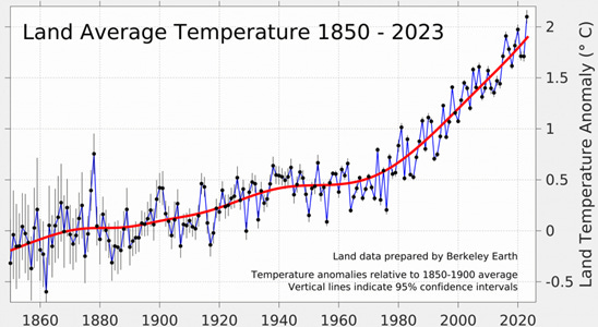 I wasn’t wrong. We had time, but we didn’t use it well. Here’s a chart showing Earth’s average land temperature relative to an 1850-1900 baseline. You can see how the warming trend accelerated after about 1980.
