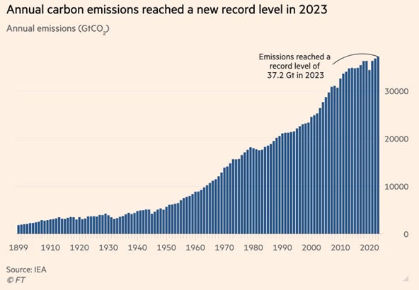 The International Energy Agency just released its 2023 emissions data. Global carbon emissions rose 1.1% to 37.4 billion tons last year, a new record.