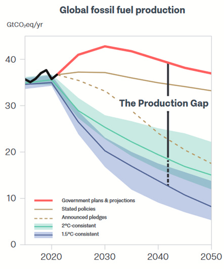 Researchers compiled production forecast data from energy agencies in the top 20 energy-producing nations. Add them all together and you get the top line of the chart. It’s expressed in “GtCO2eq/yr” or gigatons of CO2 equivalent per year. A gigaton is 1 billion tons.